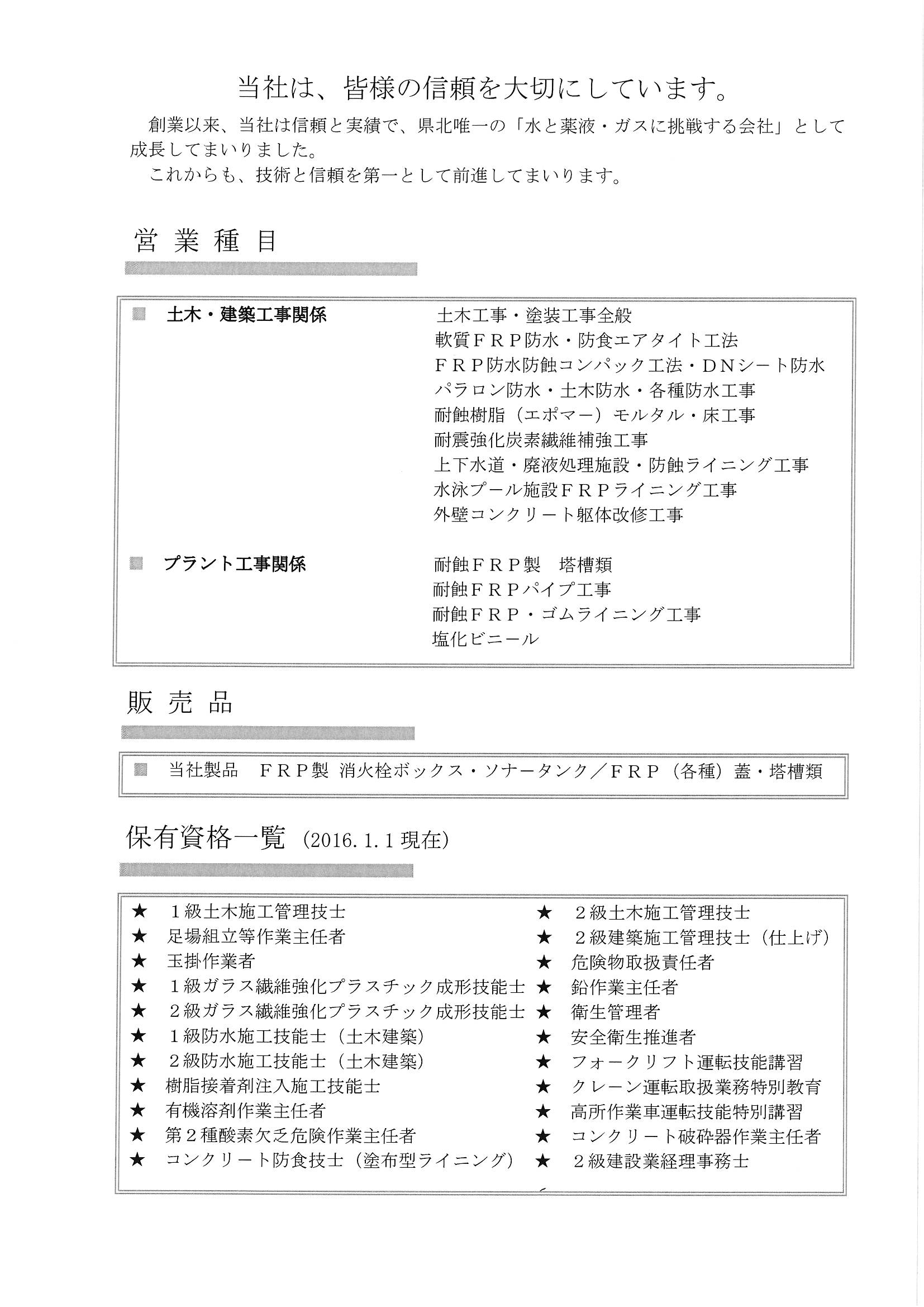 昭和44年4月に設立以来、建築・土木・プラント工場等の各種防水・超重防錆・防蝕 ・FRP(繊維強化プラスチック)の専門工事会社として日夜精進してまいりました。