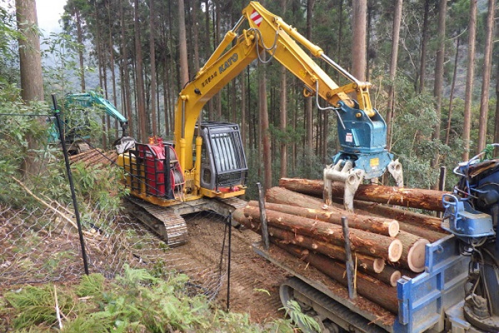 開業70年を迎えた現在の事業内容は、素材生産(間伐・皆伐)、造林(育林・松くい虫防除)、椎茸生産(原木)を主としています。高性能林業機械の導入による生産性アップと、労働災害事故防止のための研修会等、積極的な取組みを展開し、安心して働ける職場を日々築いています。